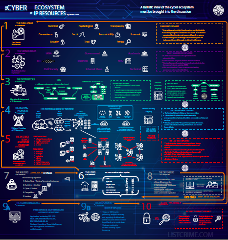 The Cyber Ecosystem of Internet Protocol Resources attempts to provide a more holistic and unified view to our approach cybercrime and cybersecurity. The map attempts to highlight a variety of different levels of people, processes, technology and physical services that make up our cyber ecosystem, so that we can start to view the internet and its borderless security problems more broadly.